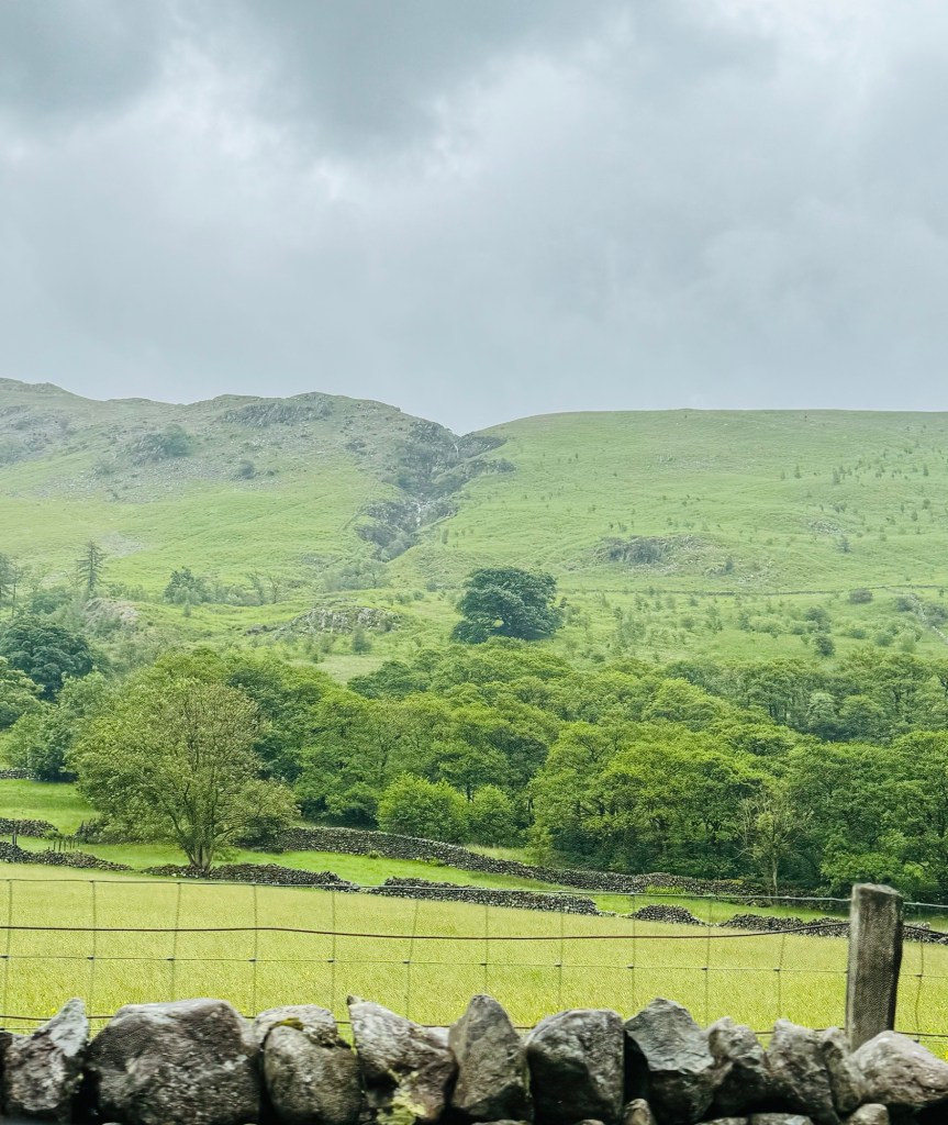 After the bar, we wandered around town a bit but since it was so rainy, and no one was out and about, everything was closed early for the evening. So here I sit listening to the falling rain, the cows mooing, and the birds chirping in the trees. Between Ireland, the Scottish Highlands, and being here in the Lakes District, I don’t know which one is more magical. With this window seat though I truly feel I could sit here for ages. Especially if I had a good book, and a good glass of wine or whiskey.