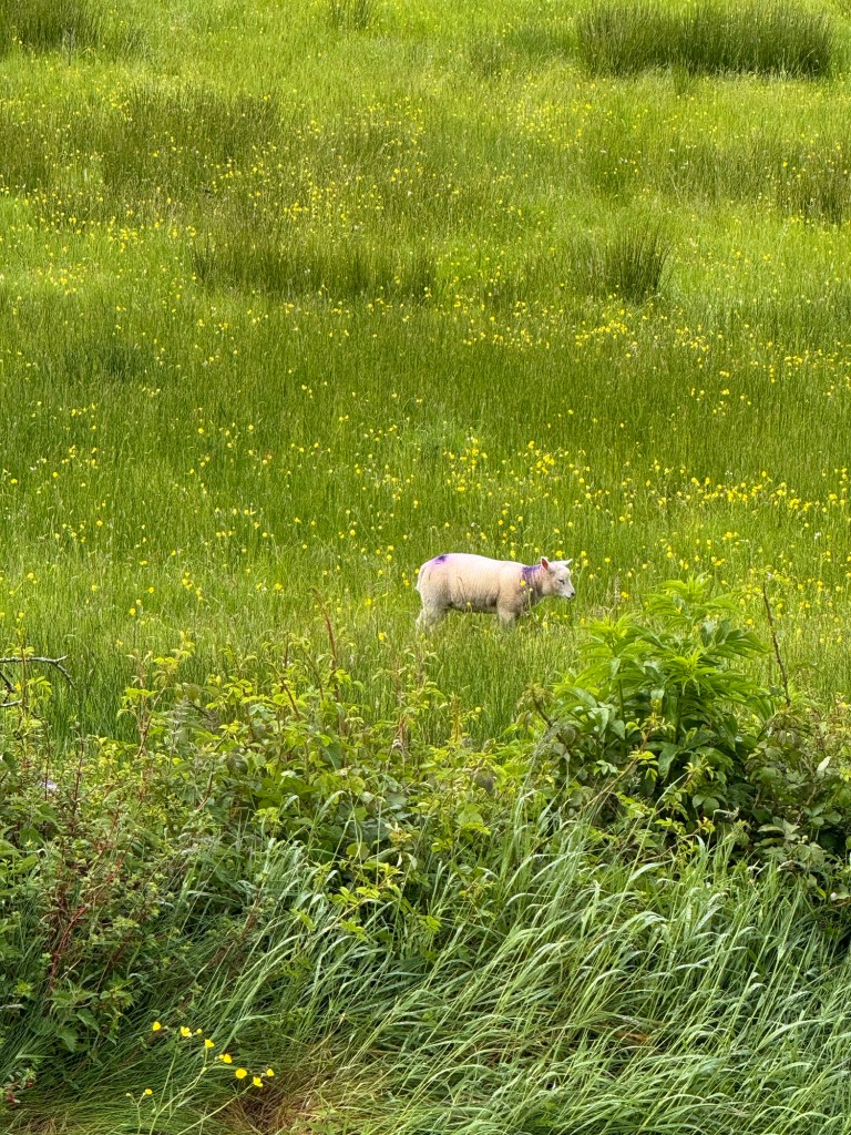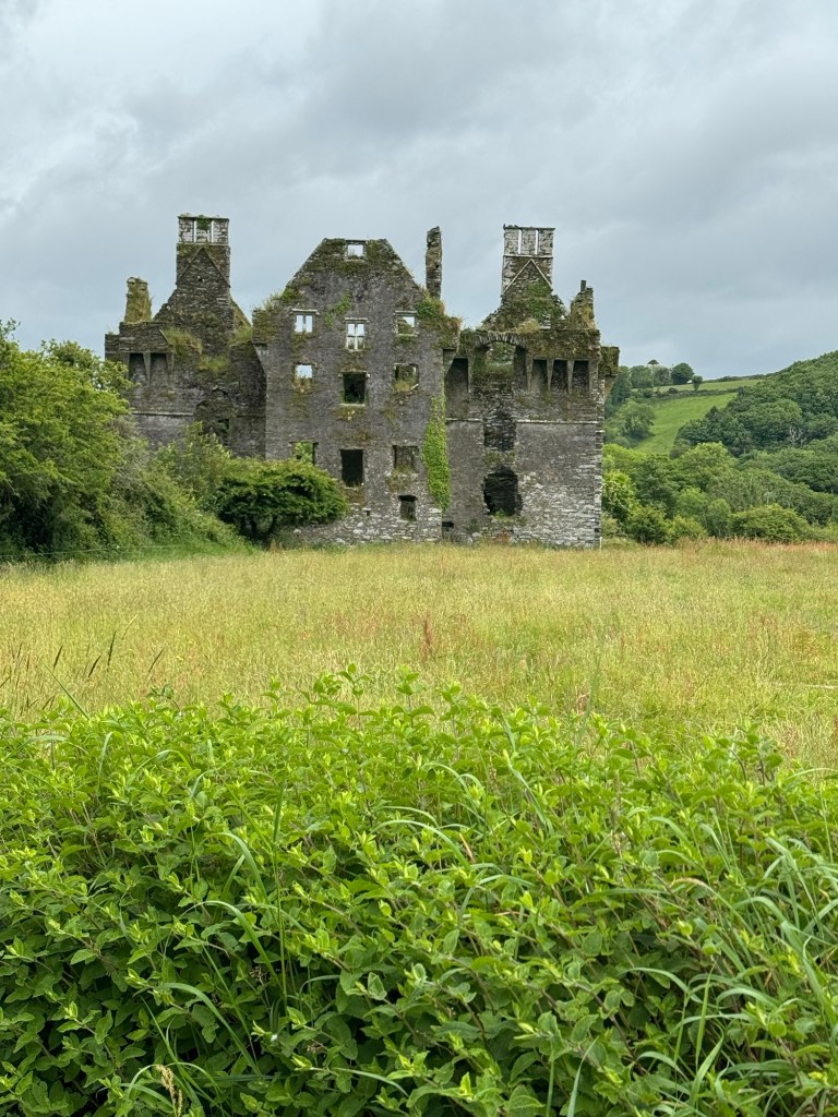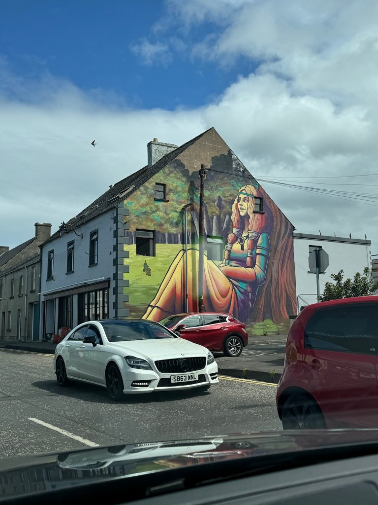 Following the hawk walk, we went to Moore Hall. It was the ruins of an old estate that was burned down during the Irish civil war in the 1920s. Ivy has completely taken over the manor and it was stunning. There was also a beautiful garden overgrown with a field full of wildflowers. It was beautiful. After that it was mid afternoon and we headed to Donegal. There were some cows being herded up a road that we had to stop and wait for but we didn’t mind. It honestly felt kind of magical. Then we stopped at what I thought was supposed to be some caves but ended up being a very steep hike up through field of sheep to the top of a hill where the hilltop fairies live. Sorry mom they didn’t wat to come out today so I wasn’t able to bring one home for you. There was a sign at the top saying to leave a gift and whisper a wish into the wind for the fairies. We didn’t bring anything up with us so I braided together some wildflowers for my offering. The wind was STRONG up there so I’m hoping every fairy in Ireland heard my wish.